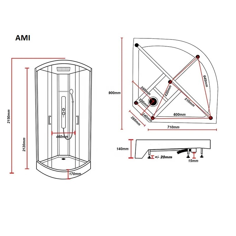 AMI (90x90x215)душ каб,низ.поддон,перед.стекла прозр.5мм,задн бел,центр.панель,крыша стекл,проф черн