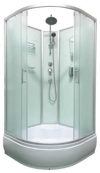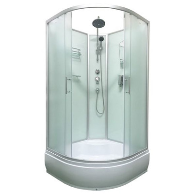 | Оснащение | Поддон, дозатор шампуней, зеркало, полки, душевая лейка. |