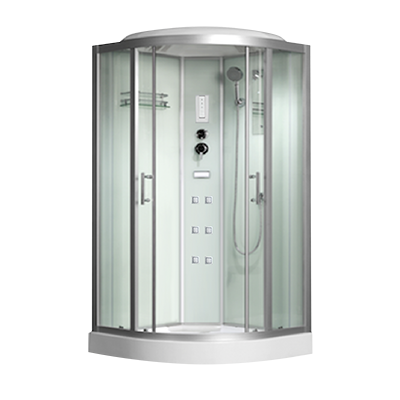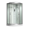 | Дополнительные характеристики | Стекло 6 мм, двухсторонняя ручка из цинковогсплава, белый верхний душ, 6 форсунок, пульт, верхняяподсветка, динамик, вентилятор, поддон на каркасе 100% акрил, двойные ролики, полочка.Сифон с функцией сбора волос.Также в комплекте идёт акриловый стул. |