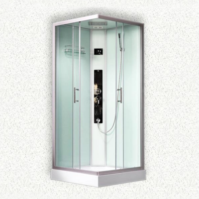 | Дополнительные характеристики | Стекло 6 мм, двухсторонняя ручка из цинкового сплава, верхний душ, гидромассаж в нержавеющей стальной панели, пульт, верхняя подсветка, динамик, вентилятор, поддон на каркасе 100% акрил, распашная дверь на петлях, полочка, лейка на держателе. Сифон с функ |