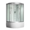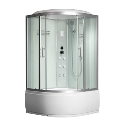 Дополнительные характеристики Стекло 6 мм, двухсторонняя ручка из цинкового сплава, белый верхний душ, 6 форсунок, пульт, верхняя подсветка, динамик, вентилятор, поддон на каркасе 100% акрил, двойные ролики, полочка, лейка на держателе. Сифон с функцией сбора волос. Высота поддона 44