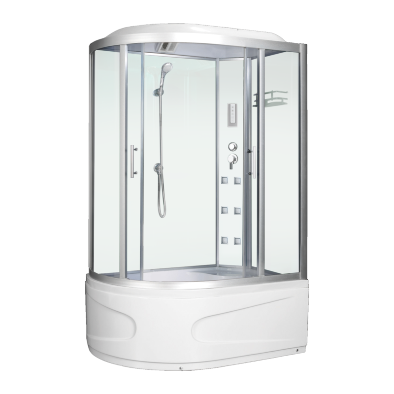 Дополнительные характеристики Стекло 6 мм, двухсторонняя ручка из цинкового сплава,белый верхний душ, 6 форсунок, пульт, верхняя подсветка,динамик, вентилятор, поддон на каркасе 100% акрил,двойные ролики, полочка, лейка на держателе.Сифон с функцией сбора волос.Высота поддона 50