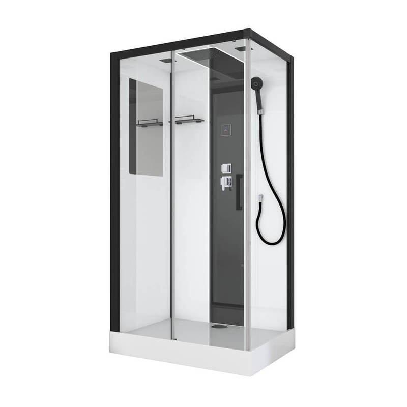 | Дополнительные характеристики | Закаленное стекло 6 мм. Черный матовый профиль. Усиленный гладкий шланг лейки. Надежные стальные ручки. Электронная панель управления с функцией Bluetooth. |