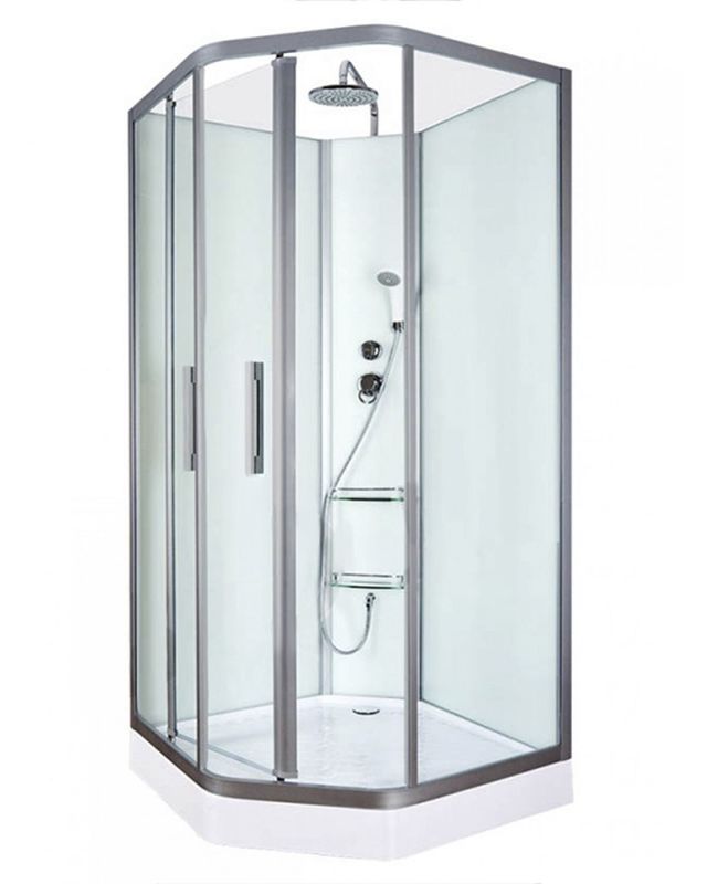 | Оснащение | Поддон, регулируемая высота ножек, верхний тропический душ на штанге 20 см, переносная лейка на шланге 150 см, полки. |