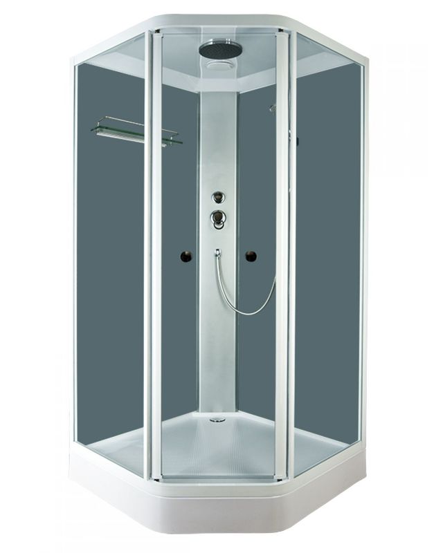 | Оснащение | Поддон, регулируемая высота ножек, верхний тропический душ - плоская лейка 20 см, переносная лейка на шланге 150 см, двойные бесшумные оцинкованные ролики 4 шт, полки. |