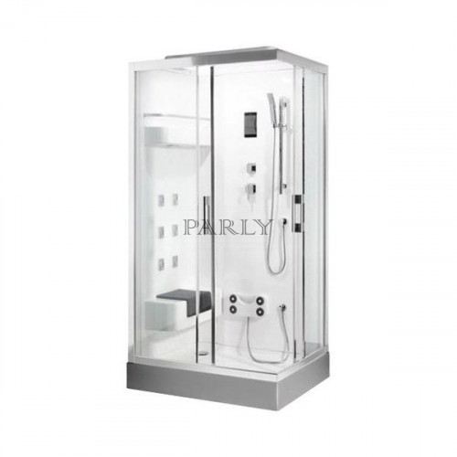 | Дополнительные характеристики | поддон низкий акриловый 170 мм на металлическом каркасе с регулируемыми ножками,со съёмной алюминиевой фронт.панелью,и европейским (широким) сливом, крыша с верх.душем, динамиком, вентилятором,и светильником FM-радио, массажер ног, сидение, полочка, душев |