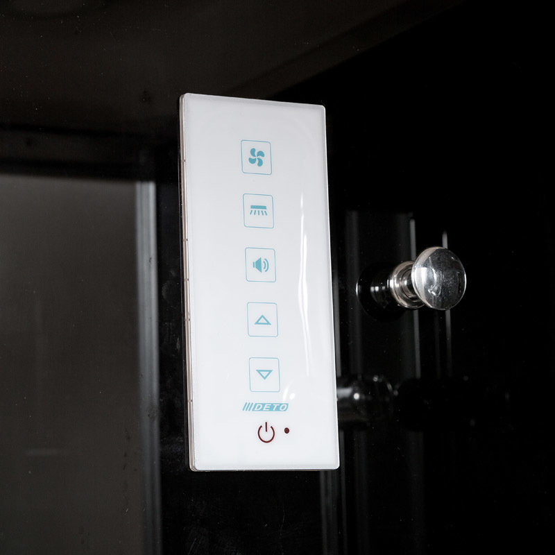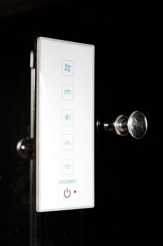 Кроме смесителя с переключателями и форсунок в кабине есть еще и блок управления. Он расположен на задней стенке душевой кабины и имеет вид области (прямоугольной, квадратной, овальной и т.д.) с кнопками или чувствительной сенсорной поверхностью. Может быть оснащен дисплеем. Иногда эту панель называют и пультом. Устройство позволяет: