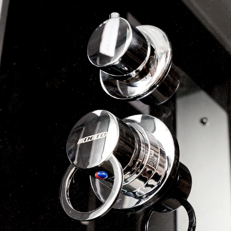 Кроме смесителя с переключателями и форсунок в кабине есть еще и блок управления. Он расположен на задней стенке душевой кабины и имеет вид области (прямоугольной, квадратной, овальной и т.д.) с кнопками или чувствительной сенсорной поверхностью. Может быть оснащен дисплеем. Иногда эту панель называют и пультом. Устройство позволяет: