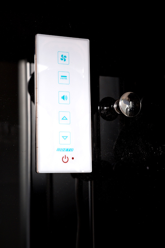Душевая кабина DETO B90S+ эл. BLACK имеет удобное электронное управление. Габариты данной модели составляют ШхВхД (см): 90*220*90. Поддон имеет форму четверть круга, высоту 45 см, тип - высокий поддон. Материал изготовления поддона - акрил. Стекло используется с узором. Кабина поставляется с крышей. Из особенностей данной модели стоит отметить, что у нее есть сиденье, нет гидромассажа. Наличие тропического душа: да.