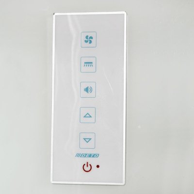 Кроме смесителя с переключателями и форсунок в кабине есть еще и блок управления. Он расположен на задней стенке душевой кабины и имеет вид области (прямоугольной, квадратной, овальной и т.д.) с кнопками или чувствительной сенсорной поверхностью. Может быть оснащен дисплеем. Иногда эту панель называют и пультом. Устройство позволяет: