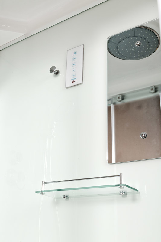 | Оснащение | Зеркало, полка, душевая лейка, вентиляция, вертикальная подсветка LED-подсветка, радио |