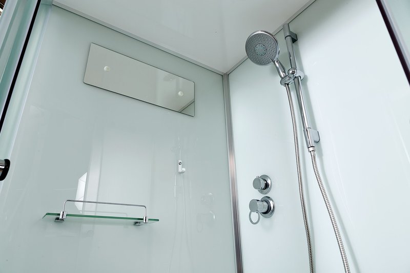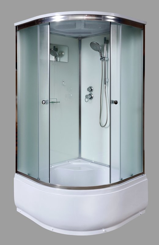 Оснащение • БЕЗСИЛИКОНОВАЯ СБОРКА • РЕЗЬБОВЫЕ СОЕДИНЕНИЯ • ДВОЙНЫЕ РОЛИКИ • усиленный акриловый поддон • антискользящее покрытие • белые закаленные задние стекла толщиной 4 мм • передние стекла 4 мм, матовые • зеркало • полочка • крепление (крючок) для мочалки • шт
