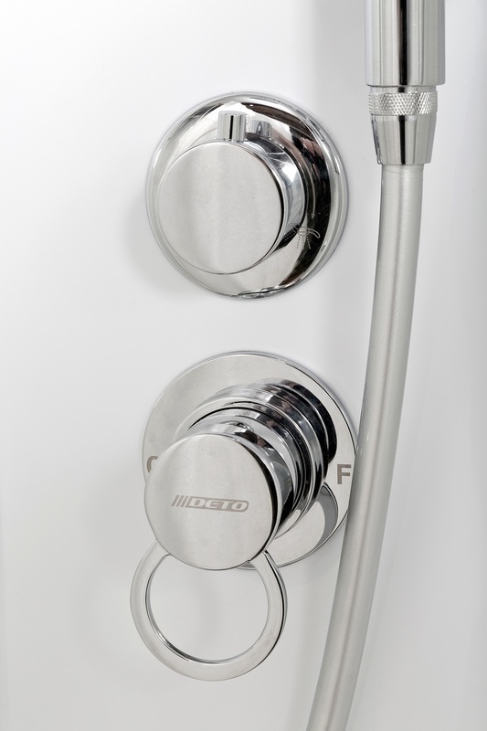 Кроме смесителя с переключателями и форсунок в кабине есть еще и блок управления. Он расположен на задней стенке душевой кабины и имеет вид области (прямоугольной, квадратной, овальной и т.д.) с кнопками или чувствительной сенсорной поверхностью. Может быть оснащен дисплеем. Иногда эту панель называют и пультом. Устройство позволяет: