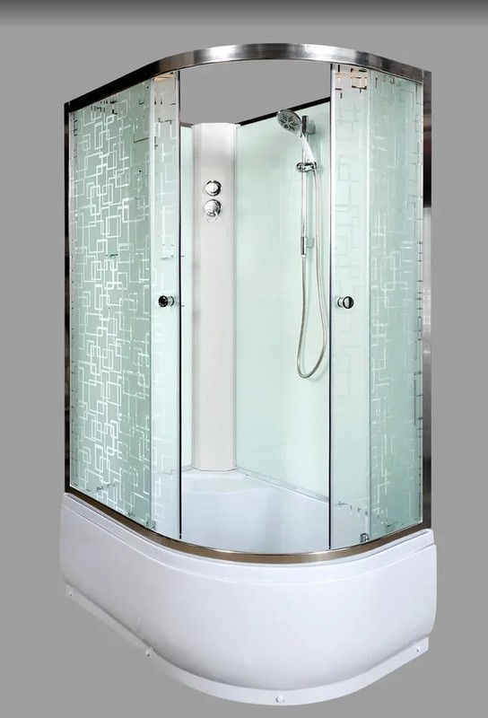 Сборка без силикона. Акриловый поддон. Стекло толщиной 5 мм, двери с красивым узором. Двойные ролики крепления двери. Производство Финляндия.