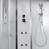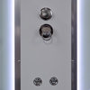 Кроме смесителя с переключателями и форсунок в кабине есть еще и блок управления. Он расположен на задней стенке душевой кабины и имеет вид области (прямоугольной, квадратной, овальной и т.д.) с кнопками или чувствительной сенсорной поверхностью. Может быть оснащен дисплеем. Иногда эту панель называют и пультом. Устройство позволяет: