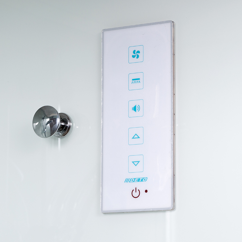 Кроме смесителя с переключателями и форсунок в кабине есть еще и блок управления. Он расположен на задней стенке душевой кабины и имеет вид области (прямоугольной, квадратной, овальной и т.д.) с кнопками или чувствительной сенсорной поверхностью. Может быть оснащен дисплеем. Иногда эту панель называют и пультом. Устройство позволяет: