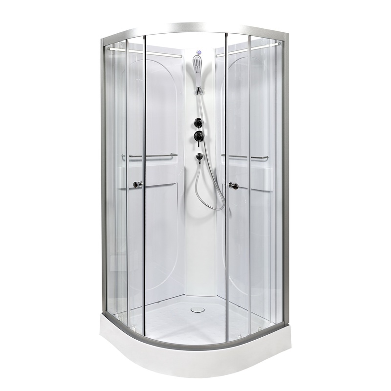 Форма поддона – четверть круга, такой вариант подходит для небольших и очень маленьких ванных. Душевой бокс монтируется в углу, максимально используя пространство. При этом кабинка остается удобной в эксплуатации, имеет достаточно места для установки душевого комплекта, небольшого раскладного сиденья при необходимости. Сегодня производители предлагают поддоны с формой четверть круга и для больших ванных. Такое решение повышает коэффициенты использования полезного пространства, позволяют правильно его организовать и сделать более практичным.