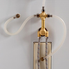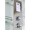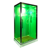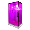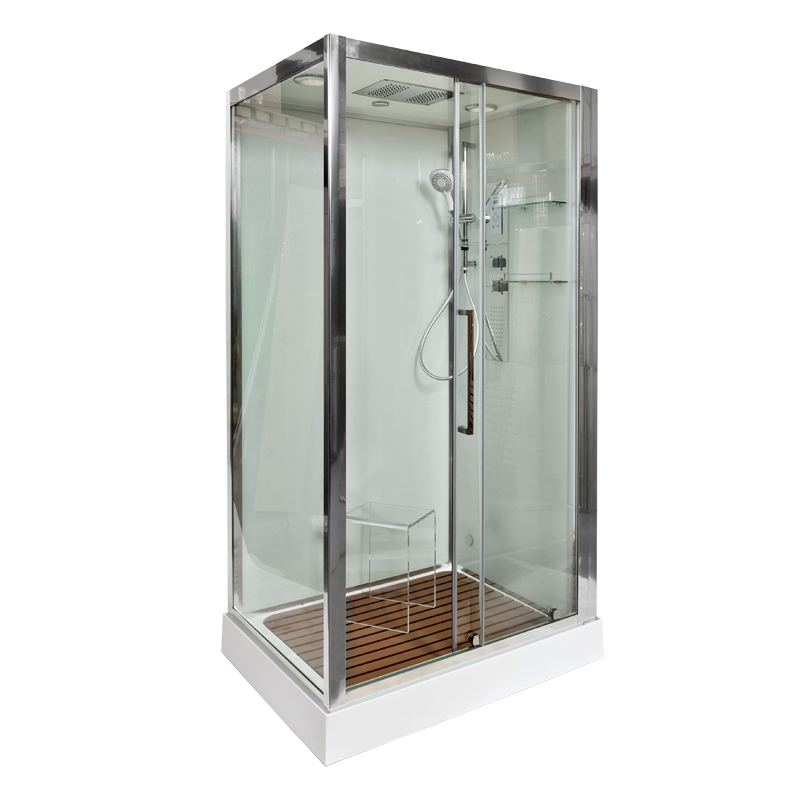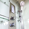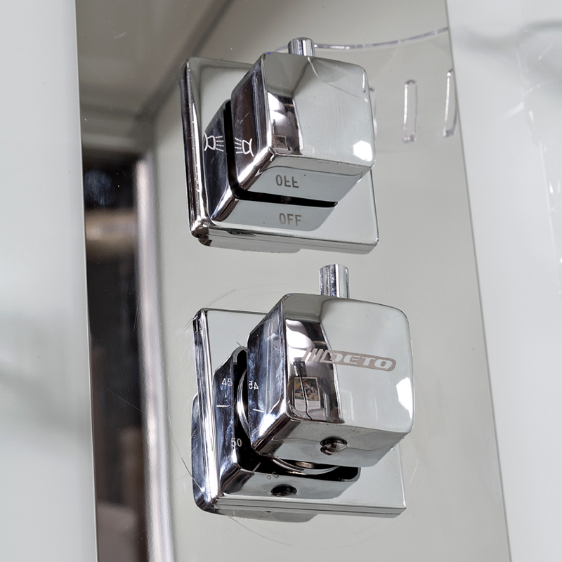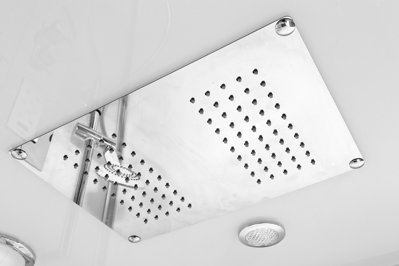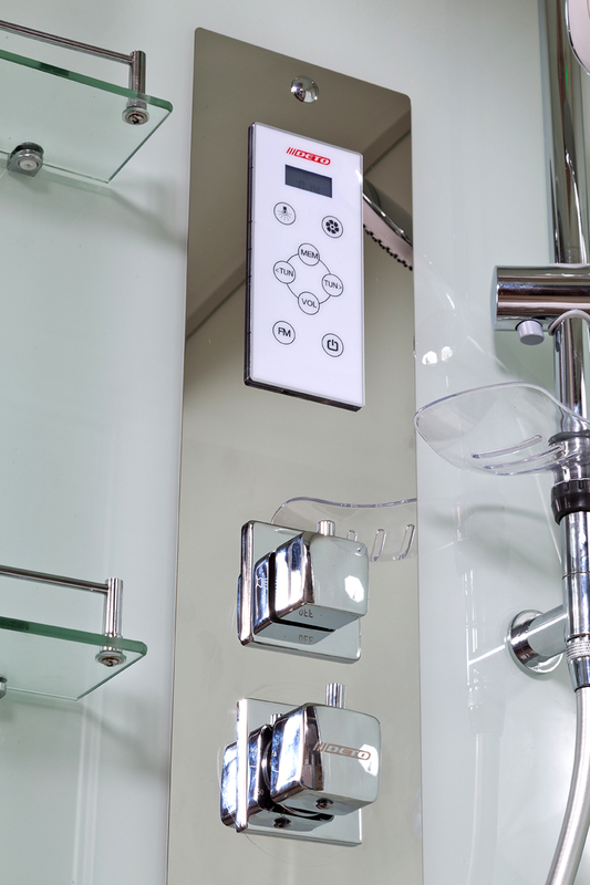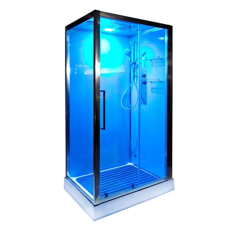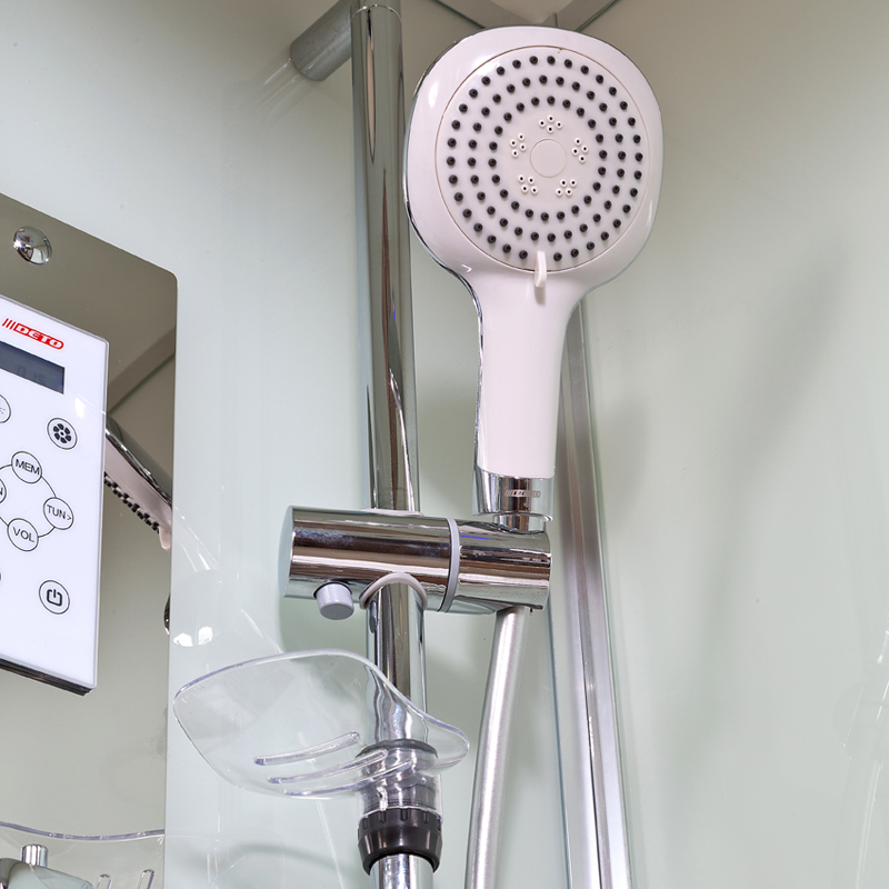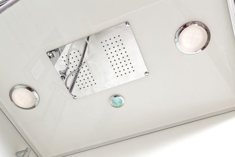 Оснащение душевая лейка, две полки, радио, светодиодная лампа с функцией хромотерапии, вентилятор