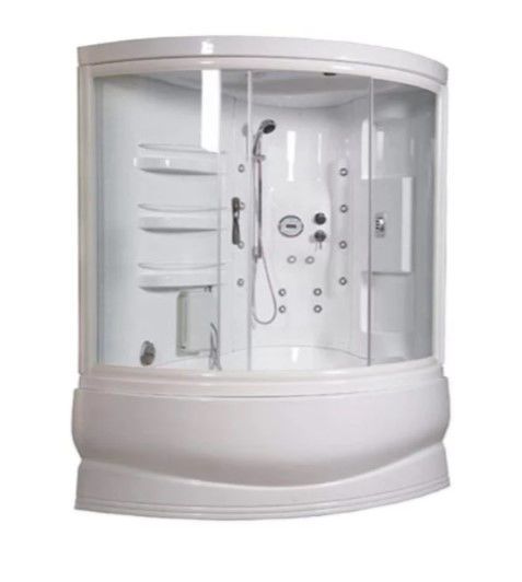Дополнительные характеристики Ограждение полностенное, стеклянные передние стенки, одна створка дверей, вертикальный гидромассаж, гидромассаж спины, гидромассаж ног, термостатический смеситель. Опционально: турецкая баня, гидромассаж в ванне, аэромассаж в ванне, верхний душ, подсветка