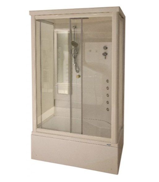 Дополнительные характеристики Ограждение полностенное, одна створка дверей, вертикальный гидромассаж, гидромассаж спины, тропический душ, термостатический смеситель.