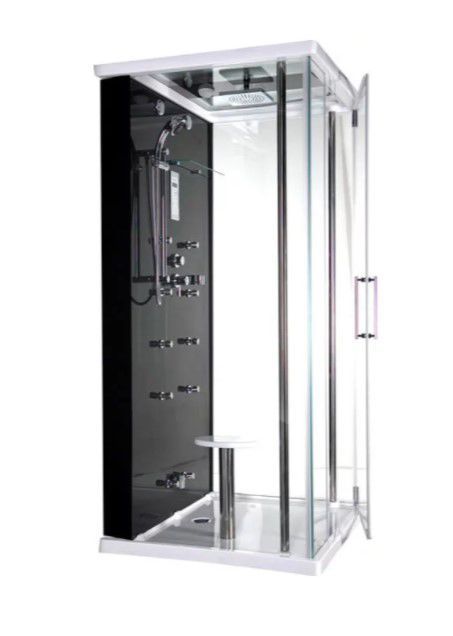 | Дополнительные характеристики | Ограждение полностенное, стеклянные передние стенки, одна створка дверей, вертикальный гидромассаж, 10 форсунок для вертикального массажа, дисплей, классический смеситель. Опционально: турецкая баня, стереофоническое радио, подсветка, контрастный душ, "бе |