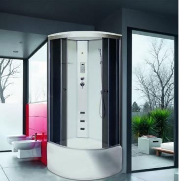 Дополнительные характеристики Усиленный акриловый душевой глубокий поддон с каркасом и фартуком; плоская крыша ABS; центральная пластиковая стойка со смесителем и тремя гидромассажными форунками; черные/белые закаленные задние стекла; тонированные/матовые передние стекла; стеклянная
