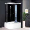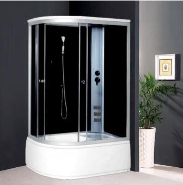 Дополнительные характеристики Усиленный акриловый душевой глубокий поддон с каркасом и фартуком; плоская крыша ABS; центральная пластиковая стойка со смесителем и тремя гидромассажными форсунками; черные/белые закаленные задние стекла; тонированные/матовые передние стекла; ручной душ
