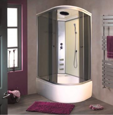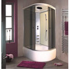 Дополнительные характеристики Усиленный акриловый душевой глубокий поддон с каркасом и фартуком; плоская крыша ABS; центральная пластиковая стойка со смесителем и тремя гидромассажными форсунками; черные/белые закаленные задние стекла; тонированные/матовые передние стекла; ручной душ