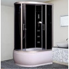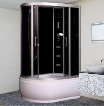 Дополнительные характеристики Усиленный акриловый душевой глубокий поддон с каркасом и фартуком; плоская крыша ABS; центральная пластиковая стойка со смесителем и тремя гидромассажными форунками; черные/белые закаленные задние стекла; тонированные/матовые передние стекла; стеклянная