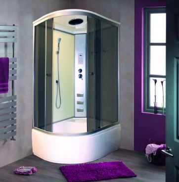 Дополнительные характеристики Усиленный акриловый душевой глубокий поддон с каркасом и фартуком; плоская крыша ABS; центральная пластиковая стойка со смесителем и тремя гидромассажными форунками; черные/белые закаленные задние стекла; тонированные/матовые передние стекла; стеклянная