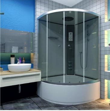 Дополнительные характеристики Усиленный акриловый душевой глубокий поддон с каркасом и фартуком; плоская крыша ABS; центральная пластиковая стойка со смесителем и тремя гидромассажными форунками; черные/белые закаленные задние стекла; тонированные/матовые передние стекла; стеклянная