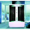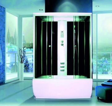 Дополнительные характеристики Усиленный акриловый душевой глубокий поддон с каркасом и фартуком; плоская крыша ABS; центральная пластиковая стойка со смесителем и тремя гидромассажными форунками; черные/белые закаленные задние стекла; тонированные/матовые передние стекла; стеклянная