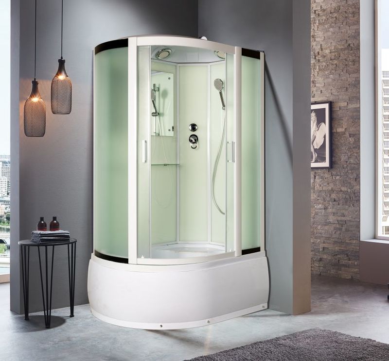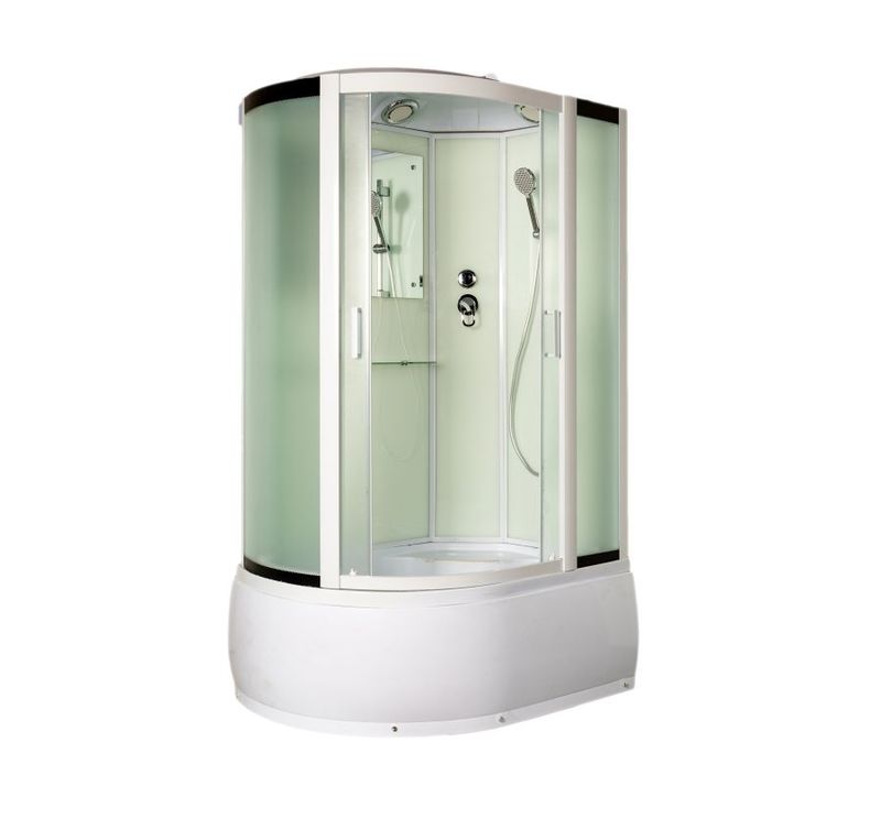 Дополнительные характеристики задние стекла: закаленное крашенное стекло (белое, 5мм), передние стекла: закаленное рифленое стекло (5 мм), профиль белый, ручки белые, смеситель с керамическим картриджем, усиленный гладкий шланг лейки, вентиляционная решетка 2 шт, двойные металлически