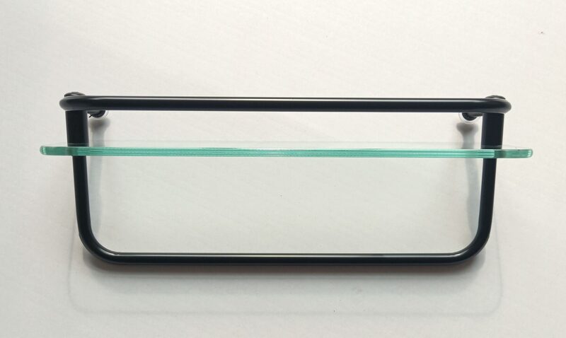 - Стеклянная полочка с ограничителем и вешалкой для банных аксессуаров