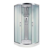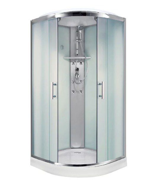 При заказе оборудования я как раз попал на период действия скидок, выгодно получилось. Даже заезжал посмотреть в ТЦ на аналогичную модель, так там стоимость на порядок дороже, включены торговые наценки, за аренду площадей да зарплату продавцам. Санузел малогабаритный, кабина вписалась в точности до см. Форма ? круга, радиус 0,8 м. Поддон низкий с широким сливом, вода успевает стечь и при сильном напоре, за борт не выходит. Стекла хорошие, закаленные, противоударные. И матовые, на них не видны разводы от воды, а то у старой кабины стекло было прозрачное, так постоянно вид не свежий. А тут все изначально замутненное, так и надо. Несмотря на изначальную недопоставку (забыли ручную лейку и еще пару деталей) впечатление от покупки в целом положительное.