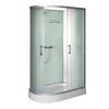 Кабина открытая, без крыши, с правосторонним размещением. Такие модели подходят не для всех ванных, зато размещаются с экономией места. Это возможно за счет закругленного края и максимального использования свободного пространства в помещении. И это при учете, что санузел у меня небольшой. Зато кабина достаточно вместительная (80 на 120 см). Внутри душевая лейка, зеркало, полка. Достаточно минималистично, все нужное под рукой. Никаких сложных программ, лишних кнопок и настроек. Мне и нужна была простая, недорогая душевая кабина, которую легко убирать и просто использовать.