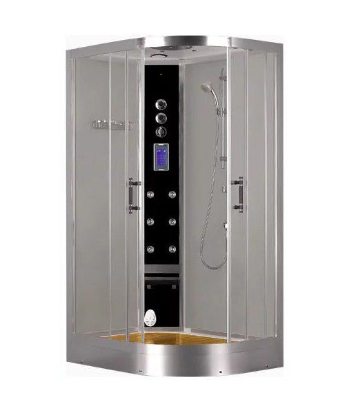 | Дополнительные характеристики | закрытая кабина левосторонняя, вертикальный гидромассаж, гидромассаж спины, ароматерапия, озонирование, вентиляция, радио, верхняя подсветка, подсветка панели управления, опционально: термостатический смеситель |
