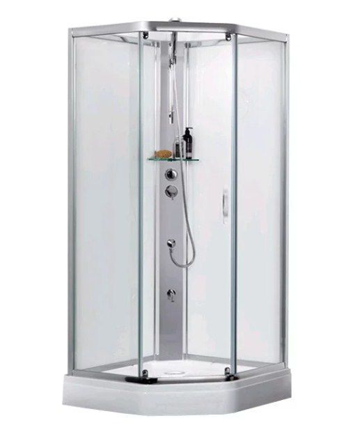 Форма поддона – многогранная, предназначенная для угловой установки. Конструкция используется при необходимости правильной организации пространства, использования площади небольшого санузла или в ванным с нестандартной, сложной конфигурацией. Визуально такой поддон кажется большим, но на самом деле он занимает не так много места. Особая многогранная форма отличается хорошей эргономикой, принимать душ будет удобно даже людям с крупной комплекцией. Минимальная длина поддона может составлять 80 см, максимальная – 120 см и даже больше, выбор зависит от площади ванной комнаты.