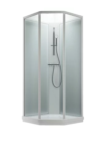 Форма поддона – многогранная, предназначенная для угловой установки. Конструкция используется при необходимости правильной организации пространства, использования площади небольшого санузла или в ванным с нестандартной, сложной конфигурацией. Визуально такой поддон кажется большим, но на самом деле он занимает не так много места. Особая многогранная форма отличается хорошей эргономикой, принимать душ будет удобно даже людям с крупной комплекцией. Минимальная длина поддона может составлять 80 см, максимальная – 120 см и даже больше, выбор зависит от площади ванной комнаты.
