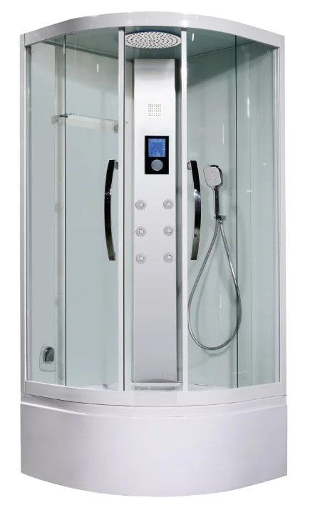 Дополнительные характеристики Ограждение полностенное, стекло Ultra white - 8 мм, количество створок двери - 2, вертикальный гидромассаж, гидромассаж спины, количество форсунок для вертикального массажа - 6, озонирование, вентиляция, Fm — радио, подключение к CD, дисплей, электронный