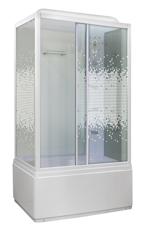 Оснащение Сифон с гофрой, Центральная стойка, Пульт, Боковая подсветка, Подсветка, Принудительная вентиляция, Гидромассаж 6 форсунок, Тропический душ, Ручной душ 3-х режимный+крепление, Полка, Смеситель 3-х режимный.