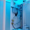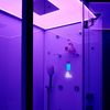 Кроме смесителя с переключателями и форсунок в кабине есть еще и блок управления. Он расположен на задней стенке душевой кабины и имеет вид области (прямоугольной, квадратной, овальной и т.д.) с кнопками или чувствительной сенсорной поверхностью. Может быть оснащен дисплеем. Иногда эту панель называют и пультом. Устройство позволяет: