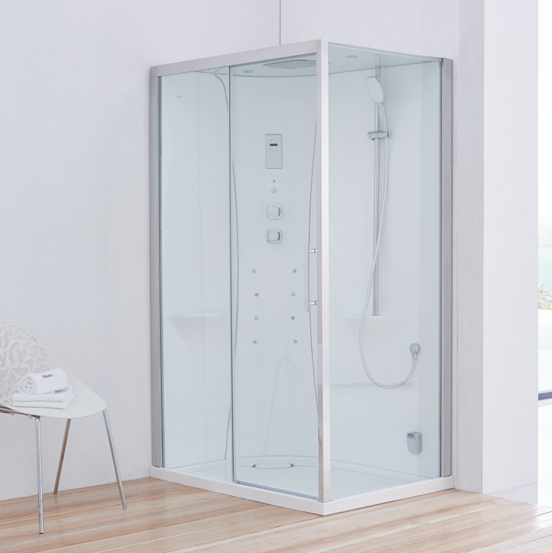 | Оснащение | Поддон, полки, душевая лейка, парогенератор, озонатор, FM радио + BLUETOOTH + телефон, вытяжка, 2 аудиодинамика, акриловая прозрачная табуретка |