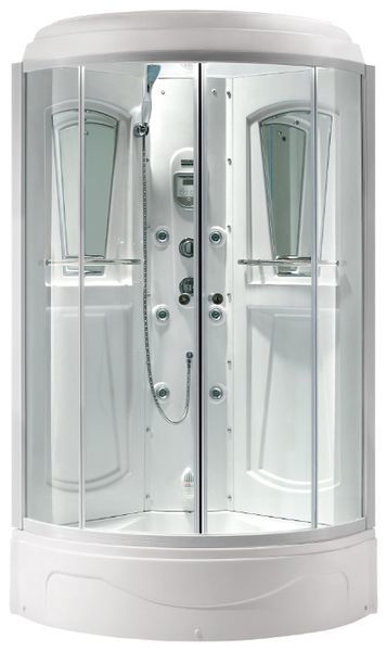 | Дополнительные характеристики | Полностенная, толщина стенок 6 мм, 2 створки двери, вертикальный гидромассаж, гидромассаж спины, тропический душ, вентиляция, радио, телефон (громкая связь), классический смеситель, дисплей, верхняя подсветка. |