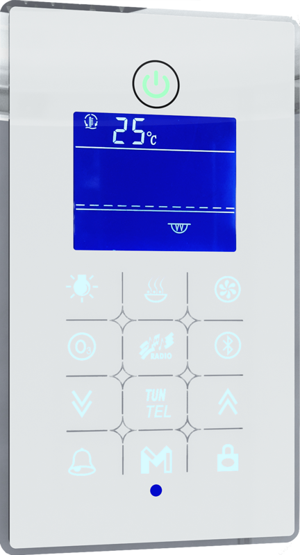 Кроме смесителя с переключателями и форсунок в кабине есть еще и блок управления. Он расположен на задней стенке душевой кабины и имеет вид области (прямоугольной, квадратной, овальной и т.д.) с кнопками или чувствительной сенсорной поверхностью. Может быть оснащен дисплеем. Иногда эту панель называют и пультом. Устройство позволяет: