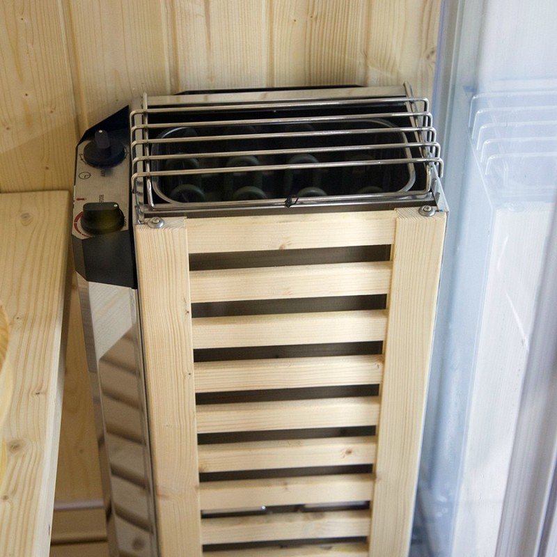 | Дополнительные характеристики | Комбинированная сауна 2 в 1: Традиционная финская сауна (сухая баня 100 *С) Влажная турецкая сауна-парная (баня 50*С) Печка-каменка 3 кВт (с электронным пультом) Пульт управления: сенсорный с дисплеем 6 мм закаленные стекла с раздвижными дверьми |