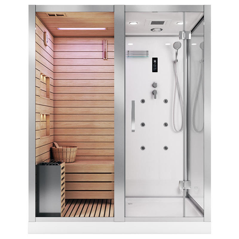 | Дополнительные характеристики | Правосторонняя. Комбинированная сауна 2 в 1: Традиционная финская сауна (сухая баня 100 *С) Влажная турецкая сауна-парная (баня 50*С) Печка-каменка 3 кВт (с электронным пультом) Пульт управления: сенсорный с дисплеем 6 мм закаленные стекла с раздвижными |