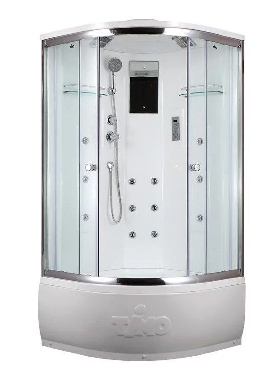 Душевая кабина Timo T-7790 имеет удобное нет информации управление. Габариты данной модели составляют ШхВхД (см): 90x225x90. Поддон имеет форму четверть круга, высоту 48 см, тип - высокий поддон. Материал изготовления поддона - акрил. Стекло используется прозрачное. Кабина поставляется с крышей. Из особенностей данной модели стоит отметить, что у нее есть сиденье, есть гидромассаж. Наличие тропического душа: да.