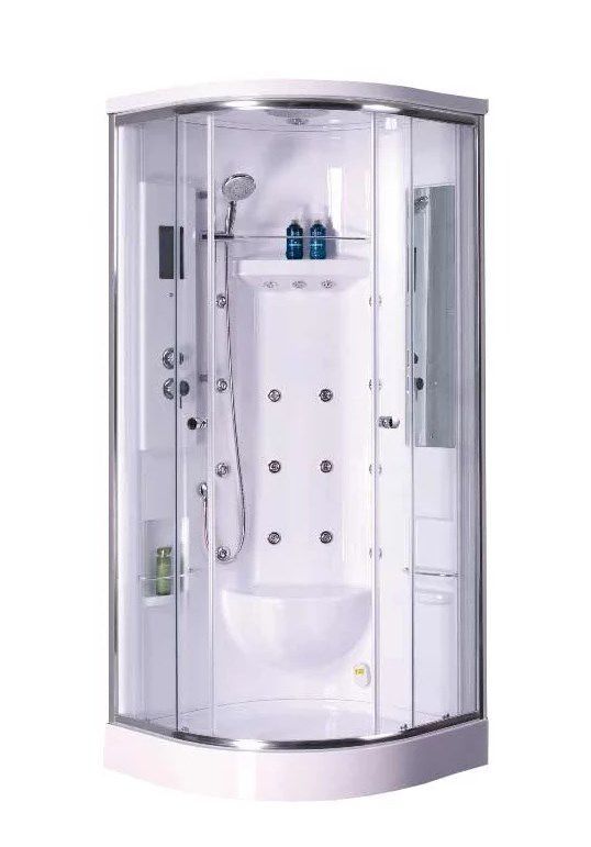 | Дополнительные характеристики | Поддон акрил Тип закрытая кабина Толщина передних стенок 6 мм Вертикальный гидромассаж, гидромассаж спины, гидромассаж зоны шеи, ароматерапия, вентиляция, радио, верхняя подсветка, подсветка панели управления, многоцветная подсветка, сенсорная панель упра |