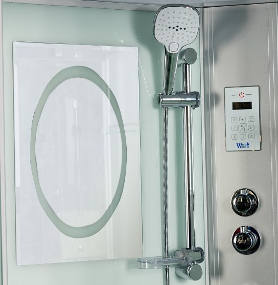 Оснащение полки, душевая лейка, зеркало, смеситель латунный с резьбовыми выходами, термостат, LED верхний свет, вентиляция, радио, Bluetooth, штанга с мыльницей